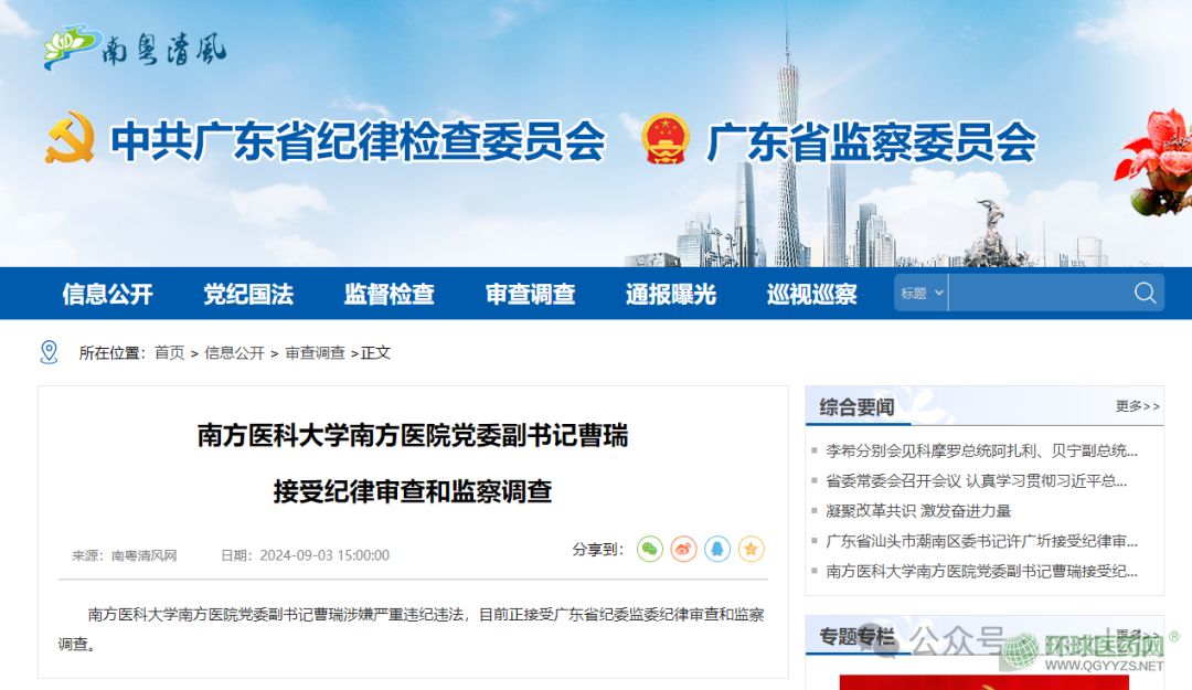 9 月 3 日,據(jù)廣東省紀(jì)檢監(jiān)察網(wǎng)“南粵清風(fēng)”公告,南方醫(yī)科大學(xué)南方醫(yī)院黨委副書記曹瑞涉嫌嚴(yán)重違紀(jì)違法,目前正接受廣東省紀(jì)委監(jiān)委紀(jì)律審查和監(jiān)察調(diào)查。