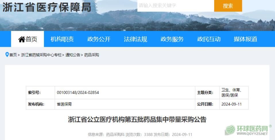 浙江省藥品醫(yī)用耗材集中帶量采購辦公室發(fā)布《浙江省公立醫(yī)療機構第五批藥品集中帶量采購公告》,報名時間為2024年9月11日至9月30日(工作日);采購周期為24個月。