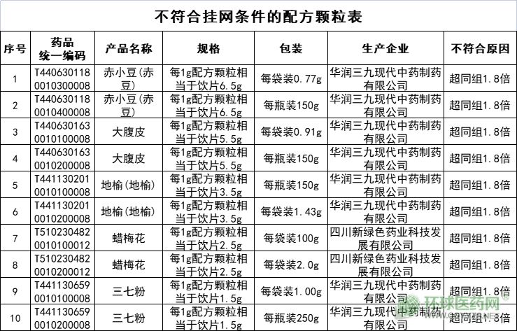 具體如下:符合掛網(wǎng)條件的中藥配方顆粒共166個(gè),包括苦地丁、黃芩、苦參等產(chǎn)品,其中符合掛網(wǎng)條件最多的企業(yè)為四川國藥天江藥業(yè)有限公司,共有88個(gè)產(chǎn)品符合掛網(wǎng)條件。不符合掛網(wǎng)條件的中藥配方顆粒共10個(gè),包括赤小豆(赤豆)、大腹皮、地榆(地榆)、蠟梅花、三七粉等產(chǎn)品,原因都為超同組1.8倍。