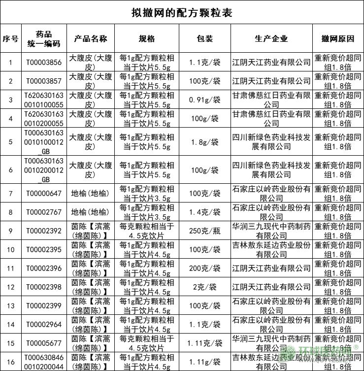 擬撤網(wǎng)的中藥配方顆粒共16個(gè),包括大腹皮(大腹皮)、地榆(地榆)、茵陳【濱蒿(綿茵陳)】等產(chǎn)品,撤網(wǎng)原因?yàn)橹匦赂們r(jià)超同組1.8倍。其中擬撤網(wǎng)最多的企業(yè)為江陰天江藥業(yè)有限公司、石家莊以嶺藥業(yè)股份有限公司,均有4個(gè)產(chǎn)品擬撤網(wǎng)。