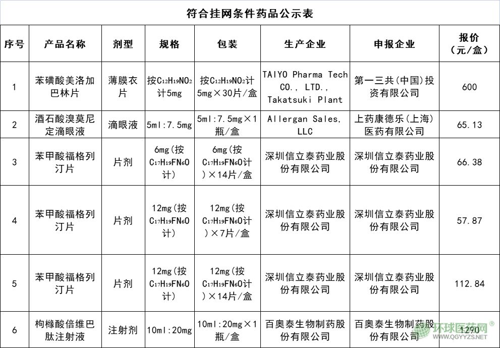 符合掛網(wǎng)條件的藥品合計6個,涉及苯磺酸美洛加巴林片、酒石酸溴莫尼定滴眼液等4個品種和深圳信立泰藥業(yè)股份有限公司、百奧泰生物制藥股份有限公司等4家生產(chǎn)企業(yè)。