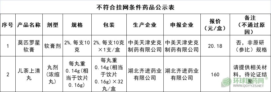 不符合掛網(wǎng)條件的藥品合計2個。其中,中美天津史克制藥有限公司的莫匹羅星軟膏,不通過原因為“否,非原研(參比)規(guī)格”;湖北齊進藥業(yè)有限公司的兒茶上清丸,不通過原因為“請?zhí)峁┫嚓P材料,待論證結果”。