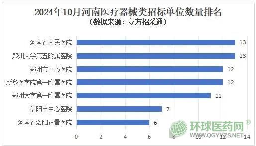 從招標單位看,在招標數(shù)量方面,10月河南醫(yī)療器械類招標單位數(shù)量普遍不多,其中河南省人民醫(yī)院和鄭州大學第五附屬醫(yī)院以13個招標項目位居榜首,招標預算總金額分別為3398.4萬元和160.02萬元。其次是新鄉(xiāng)醫(yī)學院第一附屬醫(yī)院和鄭州市中心醫(yī)院,13個招標項目。鄭州大學第一附屬醫(yī)院以11個招標項目排在第三位。