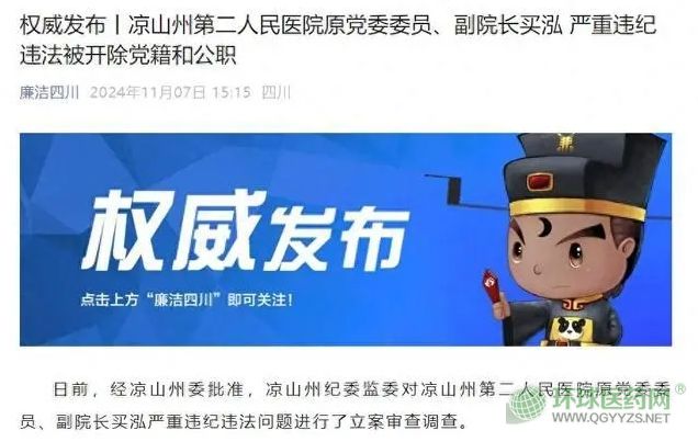 11月7日,據(jù)“廉潔四川”消息:日前,經(jīng)涼山州委批準(zhǔn),涼山州紀(jì)委監(jiān)委對涼山州第二人民醫(yī)院原黨委委員、副院長買泓嚴(yán)重違紀(jì)違法問題進(jìn)行了立案審查調(diào)查。