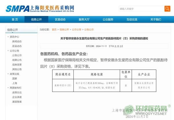11月11日,上海市醫(yī)藥集中招標(biāo)采購(gòu)事務(wù)管理所發(fā)布通知,暫停安徽永生堂藥業(yè)有限公司生產(chǎn)的氨酚待因片(Ⅱ)采購(gòu)資格。