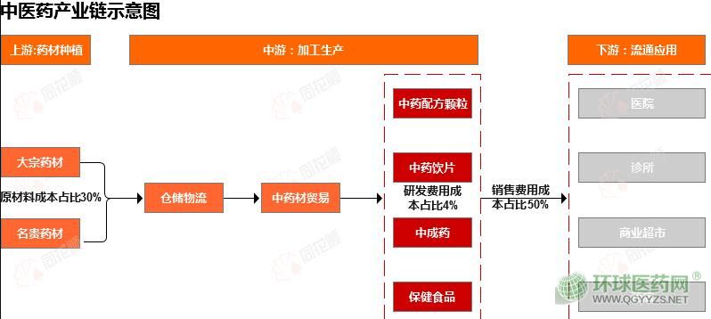 中藥產(chǎn)業(yè)鏈中,上游產(chǎn)業(yè)主要包括中藥種植業(yè),下游產(chǎn)業(yè)包括醫(yī)藥流通和居民健康等行業(yè),主要是中藥消費(fèi)市場,有醫(yī)院、藥店、部分超市和商店。從中藥成本構(gòu)成中,占據(jù)首位的是銷售費(fèi)用,成本占比50%左右,其次為中藥原材料,成本占比30%左右。