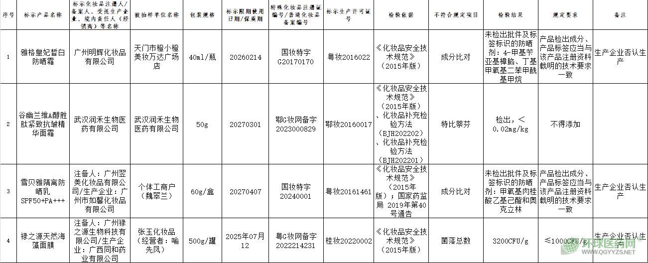 近日,湖北省藥品監(jiān)督管理局公布化妝品質(zhì)量公告(2025年第1期)。
