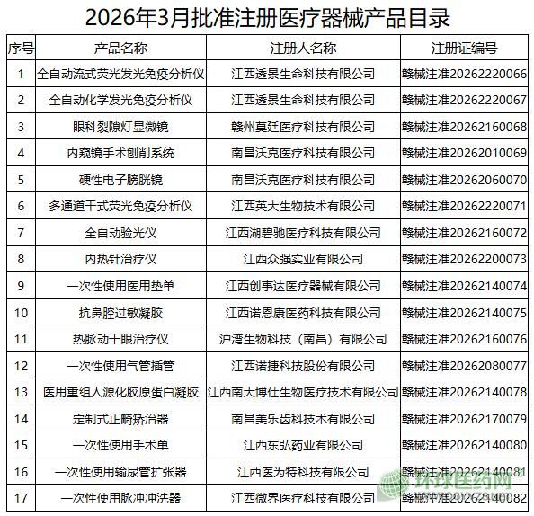 2026年3月,江西省藥品監(jiān)督管理局共批準(zhǔn)注冊境內(nèi)第二類醫(yī)療器械產(chǎn)品17個(具體產(chǎn)品見附件)。