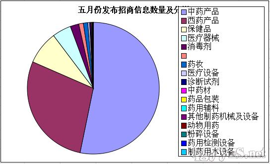 五月份,環(huán)球醫(yī)藥網(wǎng)(http://m.x4y7.cn/)新發(fā)布醫(yī)藥招商信息達到了13064條,其中發(fā)布醫(yī)藥產(chǎn)品信息主要集中在西藥產(chǎn)品、中藥產(chǎn)品、保健品及醫(yī)療器械這四大類。如下圖顯示: