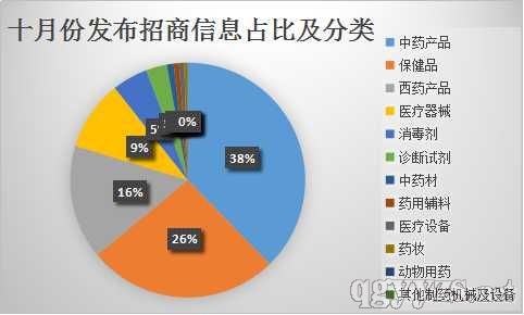 十月份,環(huán)球醫(yī)藥網(wǎng)(http://m.x4y7.cn/)新發(fā)布醫(yī)藥招商信息達到了5540條,其中發(fā)布醫(yī)藥產(chǎn)品信息主要集中在中藥產(chǎn)品、保健品、西藥產(chǎn)品及醫(yī)療器械這四大類。如下圖顯示:
