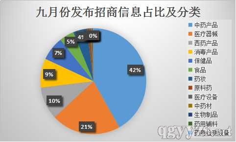 9月份,環(huán)球醫(yī)藥網(wǎng)(http://m.x4y7.cn/)新發(fā)布醫(yī)藥招商信息達到了3398條,其中發(fā)布醫(yī)藥產(chǎn)品信息主要集中在中藥產(chǎn)品、醫(yī)療器械、消毒產(chǎn)品及保健品這四大類。如下圖顯示: