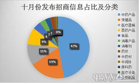 10月份,環(huán)球醫(yī)藥網(wǎng)(http://m.x4y7.cn/)新發(fā)布醫(yī)藥招商信息達(dá)到了3398條,其中發(fā)布醫(yī)藥產(chǎn)品信息主要集中在中藥產(chǎn)品、保健品、醫(yī)療器械及西藥產(chǎn)品這四大類。如下圖顯示: