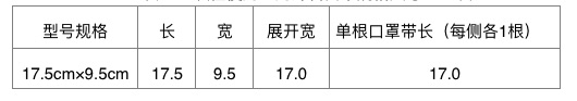 根據臨床需要,口罩設計樣式為平面耳掛式的,規(guī)格為:17.5cm×9.5cm,其具體規(guī)格尺寸見表1。