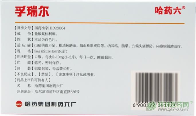 哈藥六廠鹽酸氟桂利嗪片外包裝