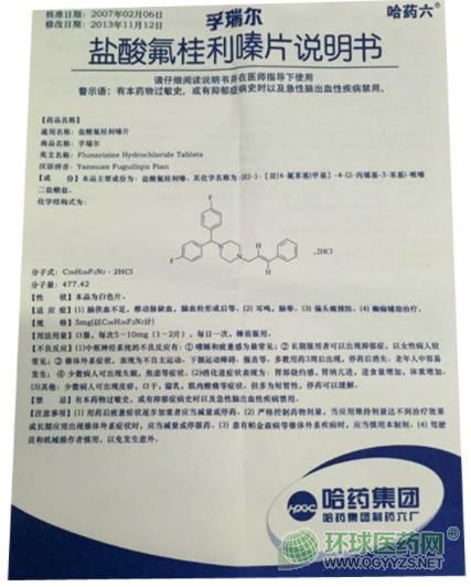 哈藥六廠鹽酸氟桂利嗪片說(shuō)明書文字版