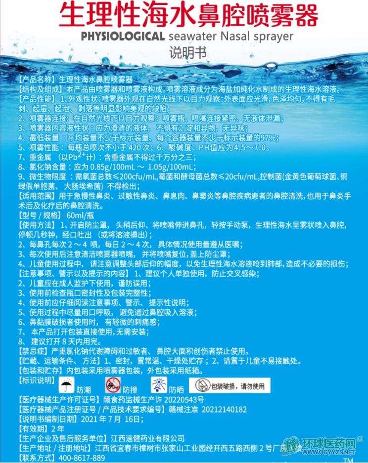 【結(jié)構(gòu)及組成】本產(chǎn)品由噴霧器和噴霧液構(gòu)成。噴霧溶波成分為海鹽加純化水制成的生理性海水溶液