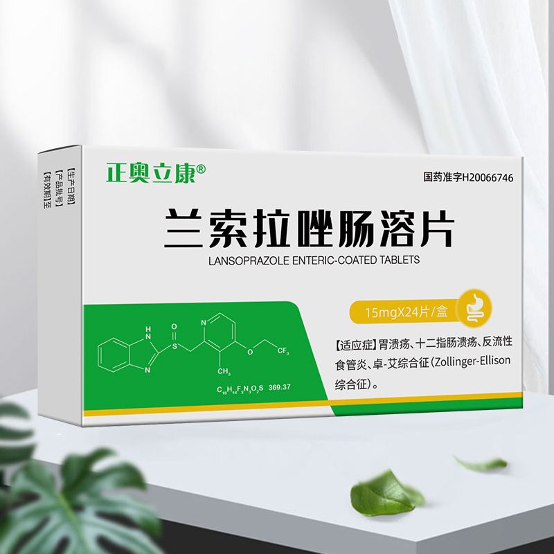蘭索拉唑腸溶片功能主治: 胃潰瘍、十二指腸潰瘍、反流性食道炎、卓-艾綜合征(Zollinger-Ellison綜合征)。