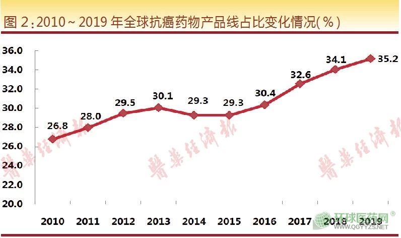 從現(xiàn)有統(tǒng)計數(shù)據(jù)來看,抗癌/抗腫瘤藥物基本已占據(jù)新藥研發(fā)的絕對主導地位,其數(shù)量呈現(xiàn)逐年增長態(tài)勢。從2010-2019年全球抗癌藥物產(chǎn)品線占比變化情況來看,在研的抗腫瘤藥物數(shù)量保持持續(xù)穩(wěn)定增長勢頭,其數(shù)量占比已從2010年的26.8%增至2019年的35.2%。這意味著,超過三分之一的在研藥物開發(fā)目標為腫瘤疾病。不難看出,整個行業(yè)的資源在向抗腫瘤藥物領(lǐng)域傾斜。而在資源有限的背景下,這種資源的過度傾斜,有可能會對其他同樣重要的臨床治療需求產(chǎn)生影響。