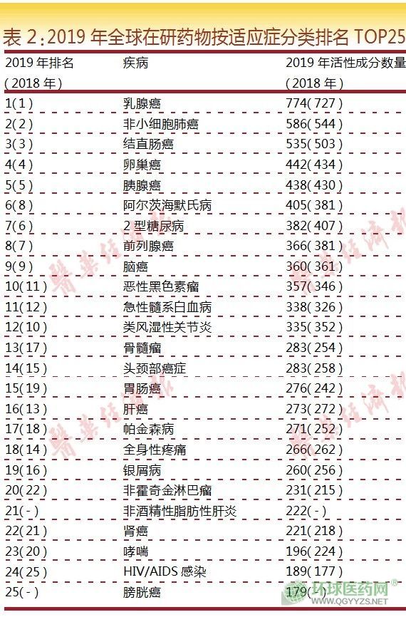 而哮喘(降幅為12.5%)、2型糖尿。ń6.1%)、類風濕性關(guān)節(jié)炎(降4.8%)和前列腺癌(降3.9%)等適應癥類別的在研藥物數(shù)量則出現(xiàn)了不同程度的下滑。