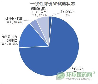 2019年上半年,仿制藥一致性評價已登記的BE試驗(yàn)185個,比2018年同期下降24.18%。登記的BE試驗(yàn)主要格局如下:BE試驗(yàn)已經(jīng)有177個完成了,同時還有15%尚未招募。