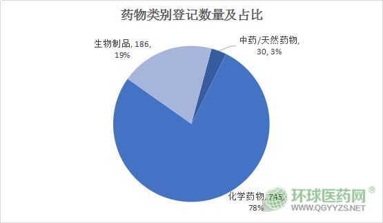 2019年上半年,CDE藥物臨床試驗(yàn)登記平臺總共公示961個臨床試驗(yàn)。其中,化學(xué)藥物 745 個,生物制品 186 個,中藥/天然藥物 30個。