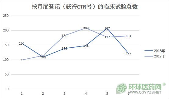 臨床試驗(yàn)登記數(shù)量來看,2019年上半年同比增加較多,其中4月更是達(dá)到了208個臨床試驗(yàn),與2018年5月的最高值207持平。