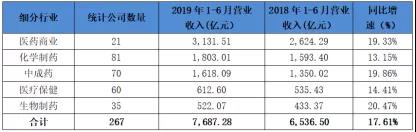 從上市公司半年報情況來看,中成藥行業(yè)營收2019年1-6月同比增長明顯。從統(tǒng)計的267家醫(yī)藥公司的營業(yè)收入對比來看,中成藥行業(yè)市場規(guī)模居第三位(在制藥工業(yè)居細(xì)分行業(yè)第二位),達(dá)到1,618.09億元,同比增長19.86%,僅次于生物制藥行業(yè),要高出化學(xué)制藥行業(yè)近7個百分點。