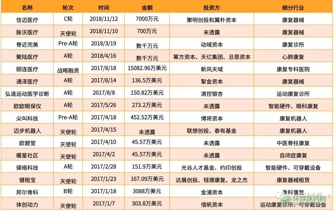 表3 2017—2018年康復(fù)醫(yī)療行業(yè)投融資情況(部分)