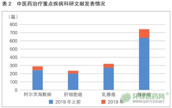 在疾病治療相關(guān)研究方面,中醫(yī)藥治療最熱門領(lǐng)域包括阿爾茨海默病、肝細胞癌、乳腺癌和糖尿病等,其中有關(guān)中醫(yī)藥在糖尿病領(lǐng)域的科學文獻,無論在歷史儲備和新增量中均處于絕對主導地位(表2)。數(shù)據(jù)顯示,2019年,糖尿病領(lǐng)域新增中醫(yī)藥相關(guān)科研文獻占比高達47.66%,其余三種疾病的科研文獻新增數(shù)量占比不到20%。