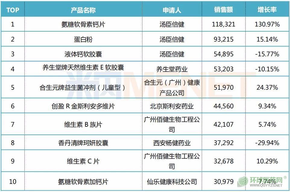 從品牌來看,湯臣倍健的氨糖軟骨素鈣片、蛋白粉以及液體鈣軟膠囊占據(jù)了前三位,其中氨糖軟骨素鈣片2018年的銷售額已破10億元,而蛋白粉也有望在2019年成為旗下第二個(gè)10億單品;此外,子公司廣州佰健生物工程公司的維生素B族片以及維生素C片占據(jù)了榜單中的第七、第九位,兩個(gè)產(chǎn)品在2018年也有著不俗的增長(zhǎng)。