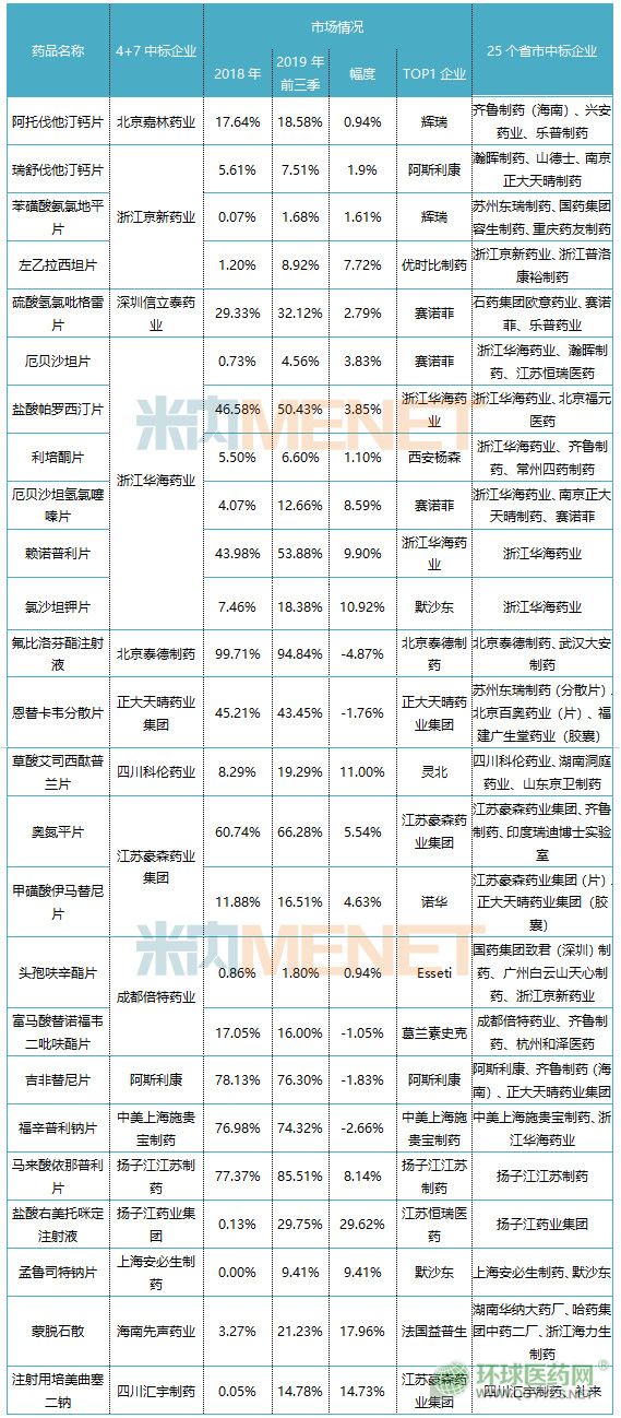據(jù)米內(nèi)網(wǎng)重點省市公立醫(yī)院終端競爭格局顯示,25個4+7中標(biāo)產(chǎn)品中有20個在2019年前三季的市場份額有提升,增幅超過10%的產(chǎn)品有5個。
