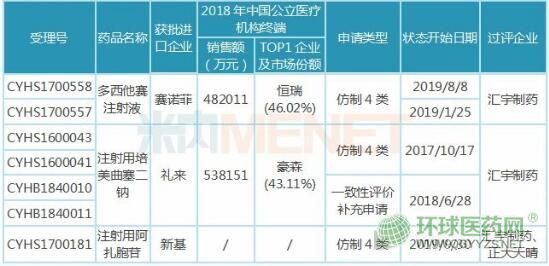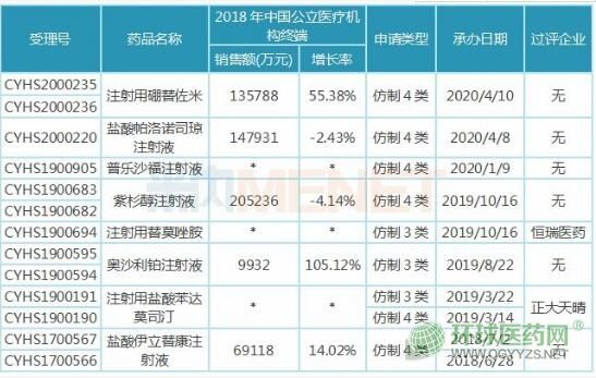 在審的8大注射劑中,除了鹽酸帕洛諾司瓊注射液為止吐止惡心藥外,其余7個注射劑均為抗腫瘤藥,紫杉醇注射液、注射用硼替佐米年銷均超10億元,在2018年中國公立醫(yī)療機(jī)構(gòu)終端抗腫瘤化藥產(chǎn)品競爭格局中,分別以2.58%、1.71%排在第16、17位。