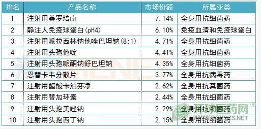 在亞類格局中,全身用抗細菌藥的市場份額獨占鰲頭,高達72.92%;全身用抗病毒藥占9.53%、全身用抗真菌藥占8.43%,分別位居第二、三位。從產(chǎn)品格局來看,前十產(chǎn)品合計市場份額占比近40%,注射劑占據(jù)主流。