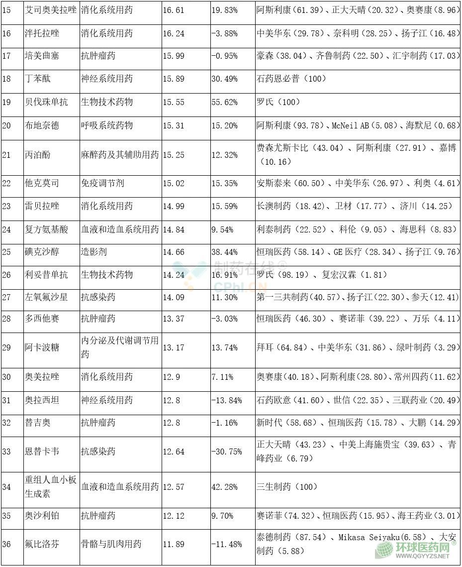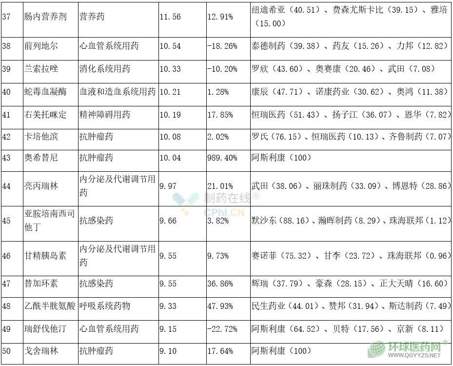 TOP50中增速超過30%的品種有10個,分別是奧希替尼(989.40%)、聚乙二醇化重組人粒細胞集落刺激因子(PEG-rhG-CSF)(73.50%)、貝伐珠單抗(55.62%)、曲妥珠單抗(48.39%)、乙酰半胱氨酸(47.93%)、重組人血小板生成素(42.28%)、紫杉醇(40.86%)、碘克沙醇(38.44%)、替加環(huán)素(36.86%)、丁苯酞(30.49%)。