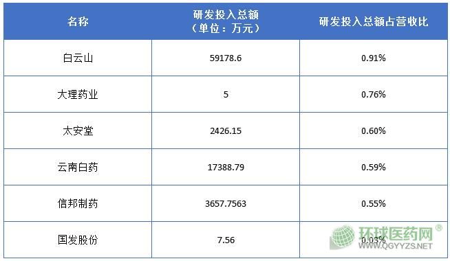 2019年,僅2家中藥企業(yè)研發(fā)投入占營收比超10%(龍津藥業(yè)和康緣藥業(yè))。更是有32家低于3.28%(2019年中藥研發(fā)投入的中位數(shù))。其中,白云山、大理藥業(yè)、太安堂、云南白藥、信邦制藥、國發(fā)股份的研發(fā)投入占營收比均未超過1%。