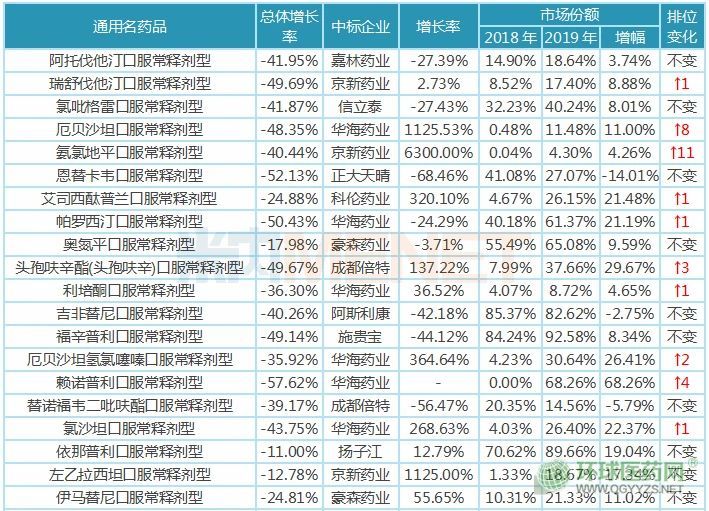 11個(gè)品種中標(biāo)企業(yè)排位不變,其中有4個(gè)品種中標(biāo)企業(yè)市場(chǎng)份額同比2018年是下滑的;14個(gè)品種中標(biāo)企業(yè)排位上升,其中有1個(gè)品種中標(biāo)企業(yè)銷售額同比2018年是下滑的,京新藥業(yè)的氨氯地平、匯宇制藥的培美曲塞上升位次均超過10位(含10位)。