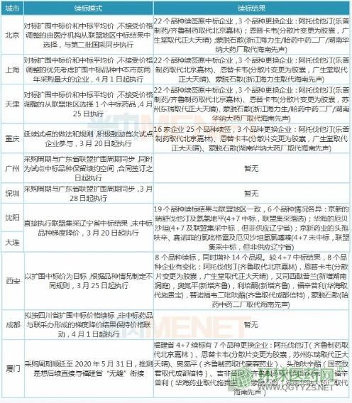 目前11個(gè)試點(diǎn)城市均對(duì)4+7集采到期后續(xù)標(biāo)問題發(fā)布通知,從續(xù)標(biāo)規(guī)則看,主要有兩種模式:1、重新談判價(jià)格型,征求“4+7”試點(diǎn)中標(biāo)企業(yè)是否愿意按照或者不高于(平均)擴(kuò)面中標(biāo)價(jià)格續(xù)約,聯(lián)盟集采未中標(biāo)企業(yè)獲得通過降價(jià)續(xù)標(biāo)的機(jī)會(huì),代表城市:上海、北京、重慶、天津、西安;2、對(duì)接省標(biāo)型,直接對(duì)接該省擴(kuò)面中標(biāo)結(jié)果,采購(gòu)周期與聯(lián)盟集采結(jié)果執(zhí)行周期同步,代表城市:廣州、深圳、沈陽、大連、成都。廈門比較特殊,4+7集采周期順延至2020年5月31日。