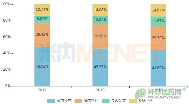 米內網(wǎng)數(shù)據(jù)顯示,近年在中國城市公立醫(yī)院、縣級公立醫(yī)院、城市社區(qū)中心及鄉(xiāng)鎮(zhèn)衛(wèi)生院(簡稱中國公立醫(yī)療機構)終端中成藥貼膏劑市場穩(wěn)步增長。從銷售渠道來看,城市公立醫(yī)院呈下滑趨勢,市場份額從超50%一路下滑,2019年跌至43.89%;而縣級公立醫(yī)院、城市社區(qū)中心及鄉(xiāng)鎮(zhèn)衛(wèi)生院則快速增長。
