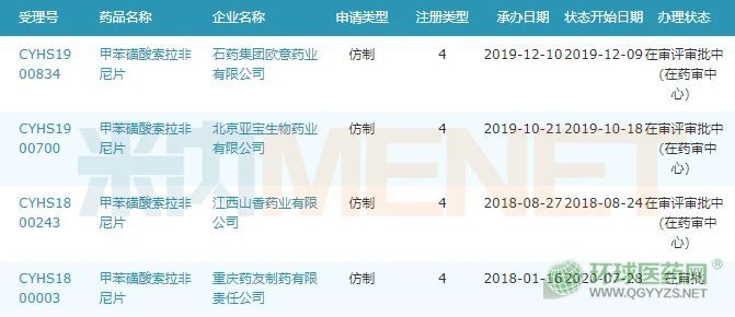 較早之前,甲苯磺酸索拉非尼片已經(jīng)吸引到了一批藥企的垂青,2016年有11家藥企的6類仿制上市申請(qǐng)獲批臨床,其中包括了輔仁藥業(yè)集團(tuán)、重慶藥友制藥、重慶圣華曦藥業(yè)、正大天晴藥業(yè)集團(tuán)、山東羅欣藥業(yè)、湖南科倫制藥、石藥集團(tuán)中奇制藥、齊魯制藥、江蘇豪森藥業(yè)等。重慶藥友制藥、江西山香藥業(yè)的4類仿制上市申請(qǐng)于2018年獲得承辦,目前重慶藥友制藥已經(jīng)進(jìn)入了審批流程,北京亞寶生物藥業(yè)、石藥集團(tuán)歐意藥業(yè)也于2019年入局,相關(guān)受理號(hào)在審評(píng)審批中。