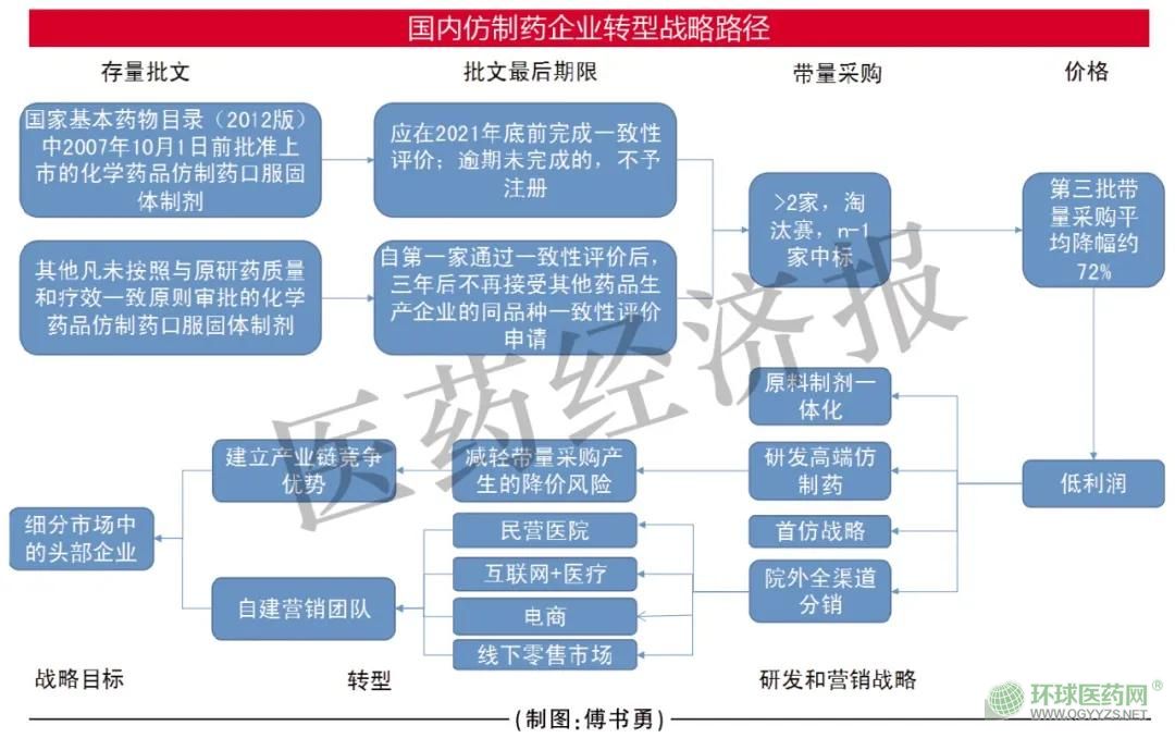 機(jī)會(huì)成本理論表明,資源是有限的,會(huì)被用在投資回報(bào)率最高的領(lǐng)域。近幾年,國(guó)家推行的系列政策,如仿制藥一致性評(píng)價(jià)、醫(yī)保控費(fèi)、重點(diǎn)監(jiān)控藥品目錄、帶量采購(gòu)、嚴(yán)厲打擊商業(yè)賄賂等改變了公立醫(yī)療機(jī)構(gòu)的市場(chǎng)格局,國(guó)家鼓勵(lì)“藥物創(chuàng)新”,“騰籠換鳥(niǎo)”,降低仿制藥價(jià)格已經(jīng)成為大勢(shì)所趨,傳統(tǒng)的代理制渠道模式逐漸被淘汰,缺乏高價(jià)格支持的仿制藥難以在公立醫(yī)療機(jī)構(gòu)市場(chǎng)生存,國(guó)內(nèi)仿制藥企業(yè)何去何從?原料制劑一體化+全渠道自建營(yíng)銷(xiāo)團(tuán)隊(duì),或許是一種不錯(cuò)的選擇,起碼可以化解價(jià)格競(jìng)爭(zhēng)帶來(lái)的部分風(fēng)險(xiǎn)。
