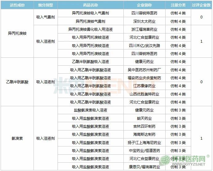 氨溴索、沙美特羅替卡松、復方異丙托溴銨、乙酰半胱氨酸、異丙托溴銨、沙丁胺醇等品種申報企業(yè)數(shù)達5家及以上,其中氨溴索競爭最激烈,共有11家企業(yè)以新分類報產(chǎn),韓美藥品的產(chǎn)品已獲批生產(chǎn)且首家過評,同時填補了氨溴索吸入劑國內(nèi)空白市場。