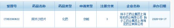 9月17日,CDE官網(wǎng)顯示,揚子江藥業(yè)集團上海海尼藥業(yè)提交的阿齊沙坦片上市申請獲得承辦,受理號為CYHS2000622。阿齊沙坦由武田制藥研發(fā),2019年全球銷售額超過7億美元。揚子江藥業(yè)集團將與恒瑞醫(yī)藥、百奧藥業(yè)角逐阿齊沙坦片首仿。