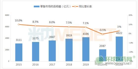 2020上半年,受“新冠”疫情影響,在人們盡量減少出行與消費(fèi)的情況下,2020上半年零售終端的藥品銷(xiāo)售規(guī)模出現(xiàn)負(fù)增長(zhǎng),但隨著人們生活逐漸恢復(fù)正常,經(jīng)濟(jì)回暖,預(yù)計(jì)2020全年零售終端的藥品規(guī)模將達(dá)到4322億元,同比去年增長(zhǎng)3%。
