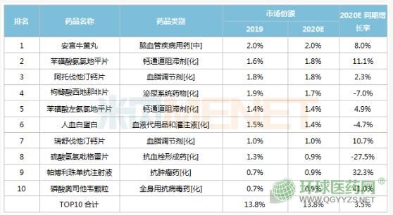 表1:2020E零售終端城市實(shí)體藥店處方藥TOP10品種排名及增長(zhǎng)趨勢(shì)