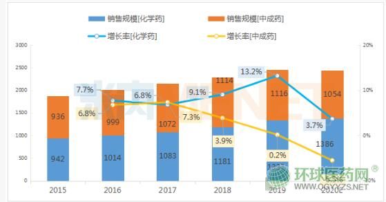 圖3:2015-2020E零售終端實(shí)體藥店中西藥規(guī)模(億元)與增長(zhǎng)率