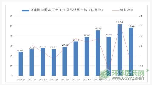 2019年,全球肺動(dòng)脈高壓原研TOP8治療藥物銷售額在50億美元左右,同比上一年略有下滑。這并不包括抗ED適應(yīng)癥的PDE-5抑制劑和前列素系列藥物。預(yù)計(jì)全球肺動(dòng)脈高壓藥物總體市場在100億美元左右。