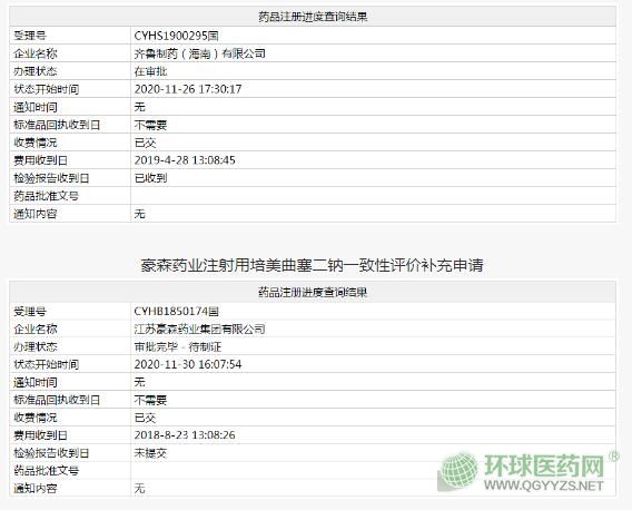 近日,NMPA官網(wǎng)顯示,齊魯制藥按仿制4類報產(chǎn)的注射用培美曲塞二鈉進入行政審批階段,有望近日獲批并視同過評。11月30日,豪森藥業(yè)該產(chǎn)品一致性評價補充申請辦理狀態(tài)變更為“審批完畢-待制證”,過評在即。米內(nèi)網(wǎng)數(shù)據(jù)顯示,2019年中國公立醫(yī)療機構(gòu)終端注射用培美曲塞二鈉銷售額超過47億元。