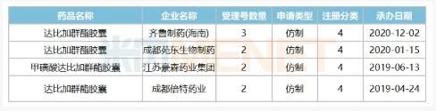2020年3月,中國(guó)生物制藥發(fā)布公告稱,附屬公司正大天晴藥業(yè)集團(tuán)開(kāi)發(fā)的新型口服抗凝血藥物達(dá)比加群酯膠囊已獲國(guó)家藥監(jiān)局頒發(fā)藥品注冊(cè)批件,為該品種國(guó)內(nèi)首家獲批,且視同通過(guò)仿制藥質(zhì)量和療效一致性評(píng)價(jià)。米內(nèi)網(wǎng)數(shù)據(jù)顯示,截至目前,除了齊魯新加入戰(zhàn)局,成都苑東生物制藥、江蘇豪森藥業(yè)集團(tuán)、成都倍特藥業(yè)均申報(bào)了4類仿制上市申請(qǐng),正在審評(píng)審批中。