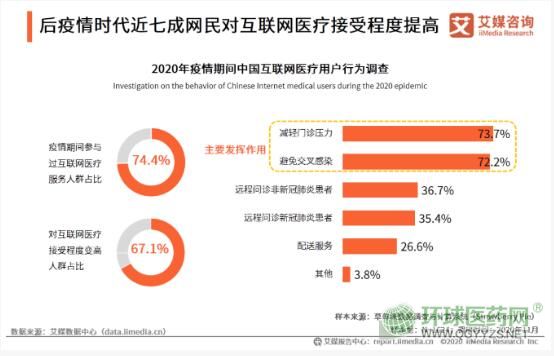 2020年新冠疫情影響下,居民對(duì)于醫(yī)藥電商、互聯(lián)網(wǎng)醫(yī)療平臺(tái)使用需求進(jìn)一步提升。艾媒咨詢(xún)數(shù)據(jù)顯示,74.4%的中國(guó)網(wǎng)民在疫情期間參與過(guò)在線問(wèn)診、醫(yī)藥電商或互聯(lián)網(wǎng)健康咨詢(xún)等互聯(lián)網(wǎng)醫(yī)療服務(wù),67.1%的網(wǎng)民表示對(duì)互聯(lián)網(wǎng)醫(yī)療接受程度有所提升。