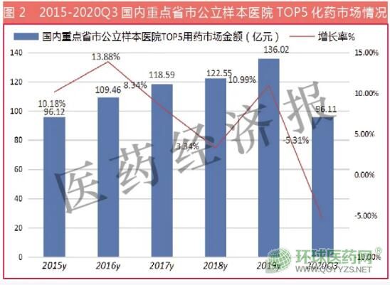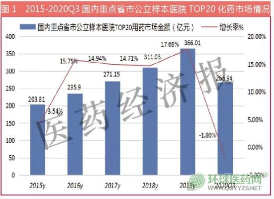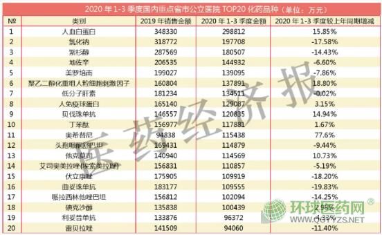 米內網數據顯示,2020年1-3季度,國內重點省市公立醫(yī)院TOP20化藥銷售額為266.94億元,占全部用藥市場的17.59%,較上一年同期下滑了1.80%。相比2019年1-3季度國內重點省市公立醫(yī)院TOP20化藥品種市場銷售額278.42億元下降了4.12%。